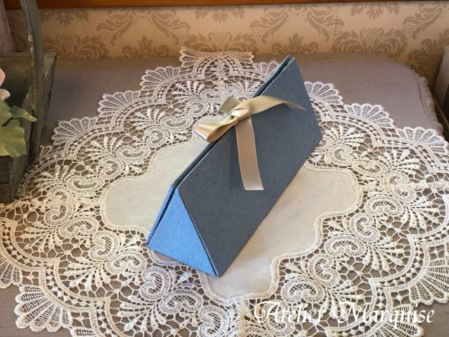 三角形の1面が蓋となっていて、上部をリボンで結ぶタイプで、